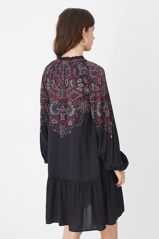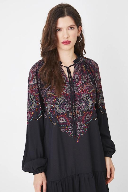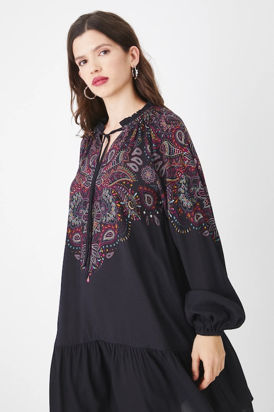 Платье из коллекции «Медицина». Свободного кроя, выполнено из набивной ткани. - Свободный покрой. - Длинные рукава реглан. - Рукава отделаны резинкой. - Острый вырез. - Декоративная окантовка по вырезу горловины. - Модель с декоративной оборкой. - Модель с принтом. - Модель мини-длины. - Длина рукава (от горловины): 72 см. - Ширина груди: 48,5 см. - Длина: 91 см. - Размеры указаны для размера: S.