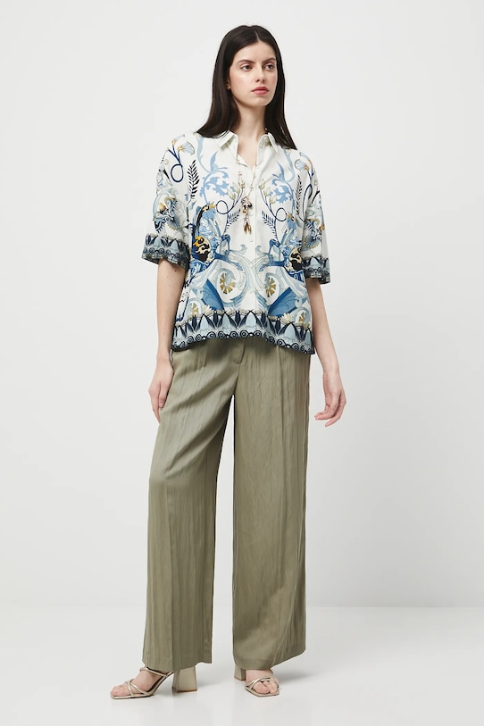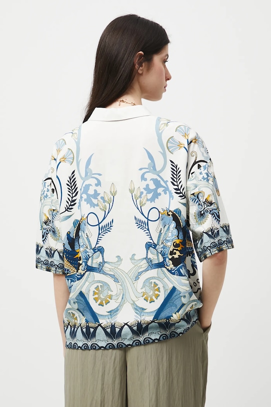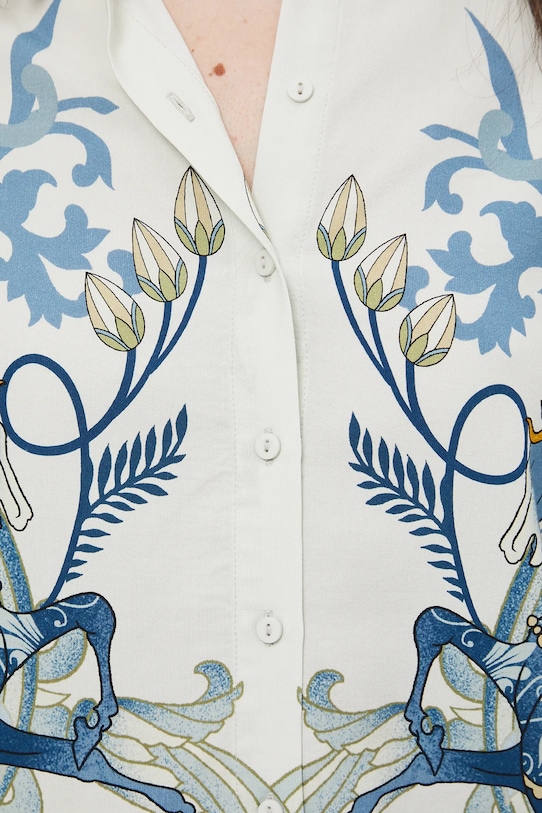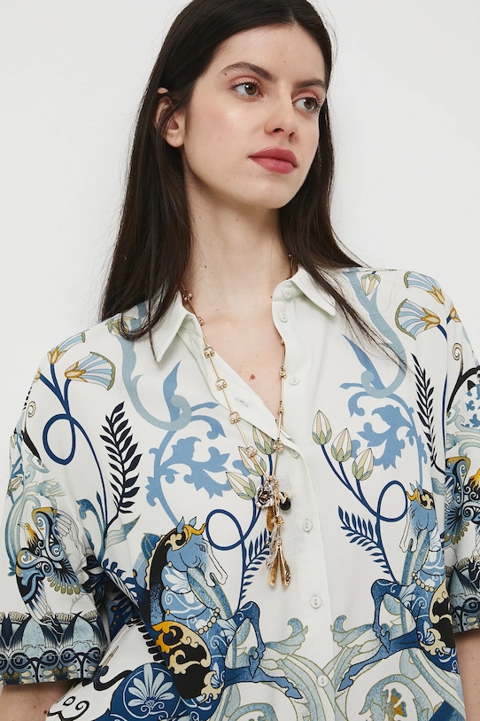 Рубашка из коллекции Medicine. Изготовлена из льняной ткани, с воротником. - Материал с добавлением льна обеспечивает комфорт и воздухопроницаемость. - Большой размер. - Рукав три четверти. - Заниженная линия плеча. - Модель с воротником. - Застежка на пуговицы. - Узорчатая ткань. - Узор с растительными и животными мотивами. - Длина: 64 см. - Ширина груди: 61 см. - Размеры указаны для размера: S.