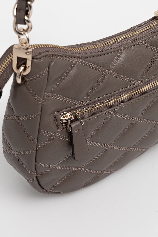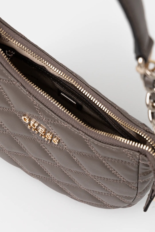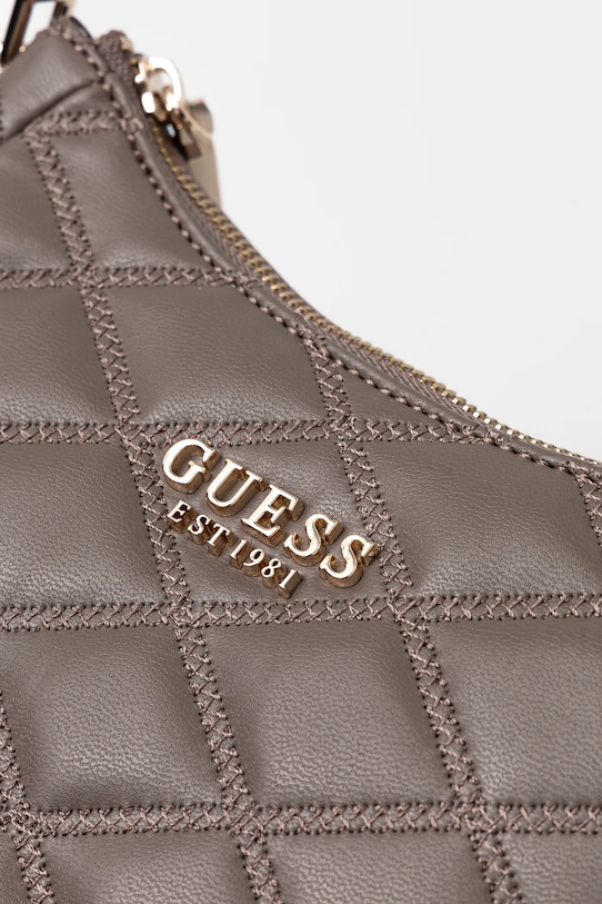 Небольшая сумочка из коллекции Guess. Модель на молнии, выполнена из экокожи. - Съемная ручка. - Карман на молнии на задней стороне позволяет безопасно хранить телефон или другие мелкие предметы. - Три внутренних кармана: один на молнии, два накладных. - Входящий в комплект тканевый чехол защищает изделие от пыли. - Не подходит для формата А4. - Ширина у основания: - Высота: - Глубина: - Длина ручки: