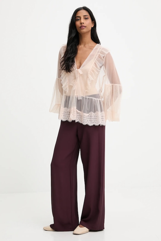Эта блузка из коллекции Answear.LAB выполнена из прозрачного материала. Полиэстер обеспечивает повышенную устойчивость к сминанию. - Простой дизайн, не стесняющий движений. - Рукав три четверти. - Модель с декоративными оборками. - Расклешенный рукав. - Модель с регулируемой шнуровкой. - Длина рукава (от горловины): 51 см. - Длина: 60 см. - Ширина под мышками: 45 см. - Размеры указаны для размера: S.