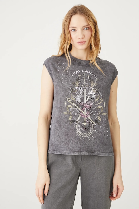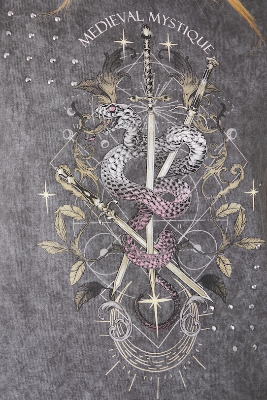 Футболка из коллекции «Медицина». Изготовлена из трикотажного полотна с принтом и аппликацией. - Обычная посадка. - Короткие рукава кимоно. - Круглый ребристый вырез. - Модель с принтом. - Модель со стразами. - Печать спереди с надписью: средневековая мистика. - Материал с эффектом стирки. - Принт с изображением животных. - Длина: 60,5 см. - Ширина груди: 51 см. - Размеры указаны для размера: S.