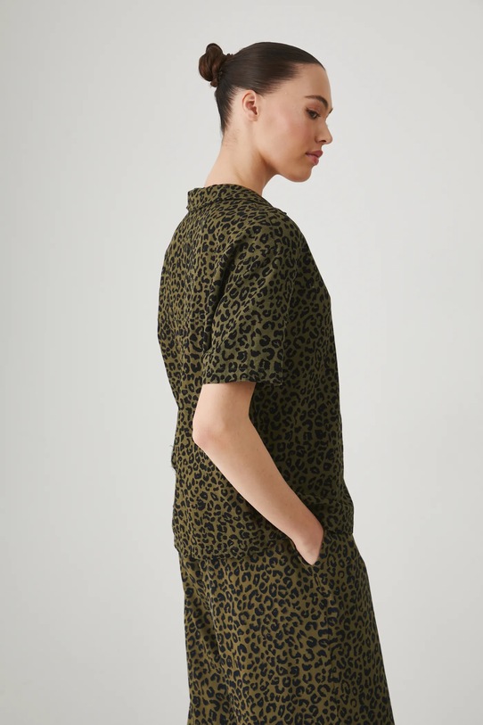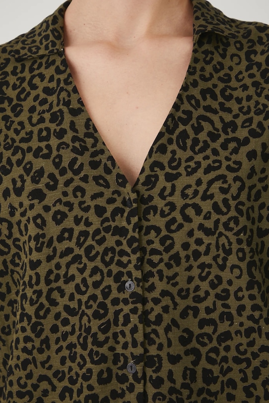 Эта блузка из коллекции Medicine выполнена из смесовой льняной ткани и имеет заостренный вырез. - Материал с добавлением льна обеспечивает комфорт и воздухопроницаемость. - Большой размер. - Короткий рукав. - Заниженная линия плеча. - Острый вырез с воротником. - Застежка на пуговицы. - Узорчатая ткань. - Леопардовый узор. - Длина: 65 см. - Ширина груди: 57 см. - Размеры указаны для размера: S.