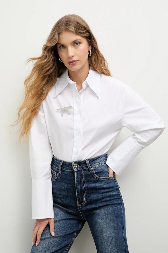 Эта рубашка из коллекции Answear.LAB выполнена из тонкой, слегка эластичной ткани. Она дополнена эффектной брошью. - Простой дизайн, не стесняющий движений. - Застежка на пуговицы. - Манжеты на пуговицах. - Удлиненный задний край обеспечивает защиту во время движения. - Длина рукава: 55 см. - Длина спинки: 73 см. - Длина спереди: 68 см. - Ширина под мышками: 47 см. - Размеры указаны для размера: S.