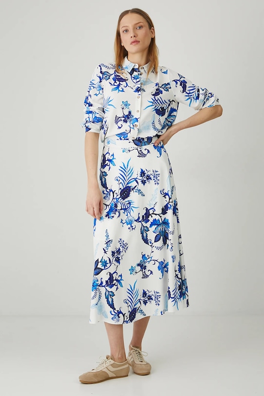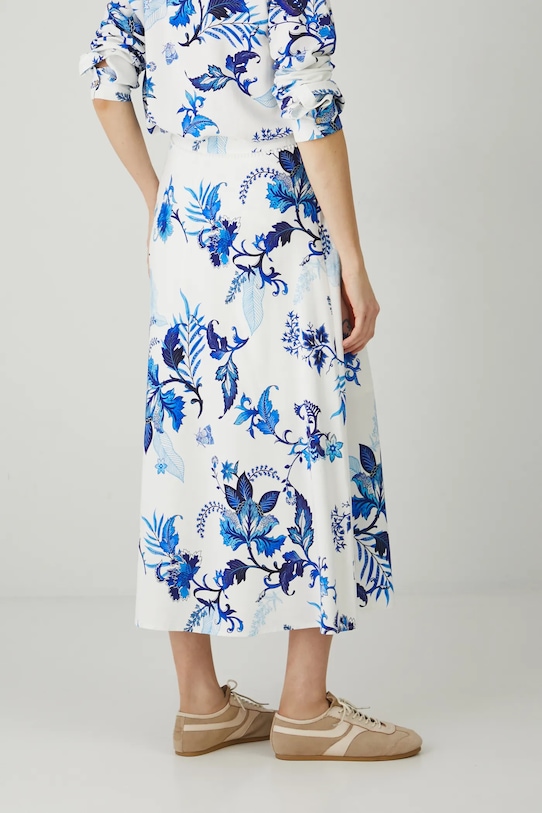 Юбка из коллекции Medicine. Расклешенный фасон из смесовой льняной ткани. - Материал с добавлением льна обеспечивает комфорт и воздухопроницаемость. - Расклешенный крой. - Повышенное состояние. - Застежка-молния. - Декоративные детали. - Узорчатая ткань. - Узор с растительными и животными мотивами. - Модель макси длины. - Ширина талии: 35 см. - Длина: 88 см. - Размеры указаны для размера: S.