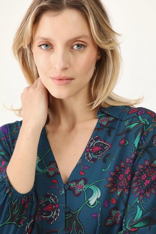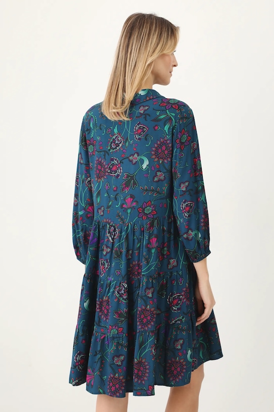 Платье из коллекции «Медицина». Свободного кроя, выполнено из узорчатой ткани. - Свободный покрой. - Рукав три четверти. - Острый вырез с воротником. - Короткая планка с пуговицами. - Модель с декоративными оборками. - Узорчатая ткань. - Узор с растительным мотивом. - Модель мини-длины. - Ширина груди: 50,5 см. - Ширина талии: 47,5 см. - Длина: 93,5 см. - Размеры указаны для размера: S.