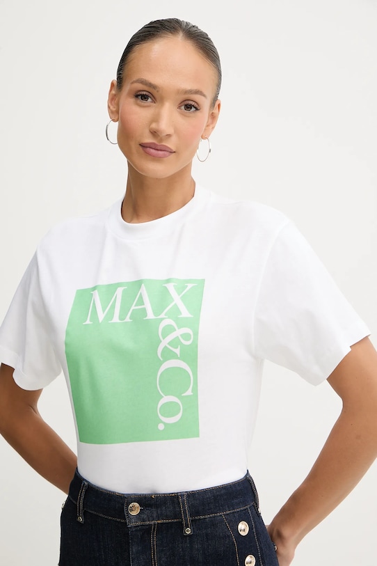 Футболка из коллекции MAX&Co. Изготовлена из тонкой, эластичной ткани. Изготовлена из дышащего хлопкового материала. - Свободный крой, обеспечивающий полную свободу движений. - Круглый ребристый вырез. - Короткий рукав. - Крой рукава со спущенной линией плеча не ограничивает подвижность. - Графический логотип бренда спереди. - Длина: 68 см. - Ширина под мышками: 50 см. - Размеры указаны для размера: S.