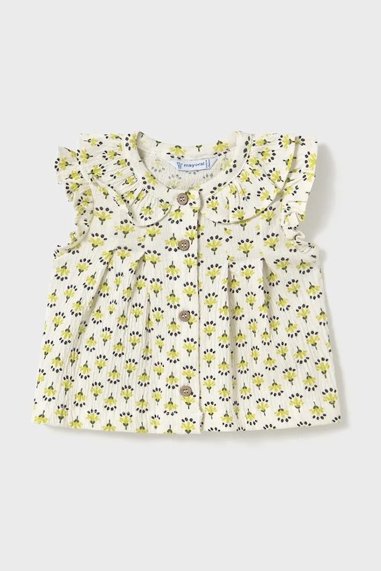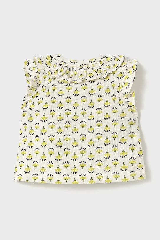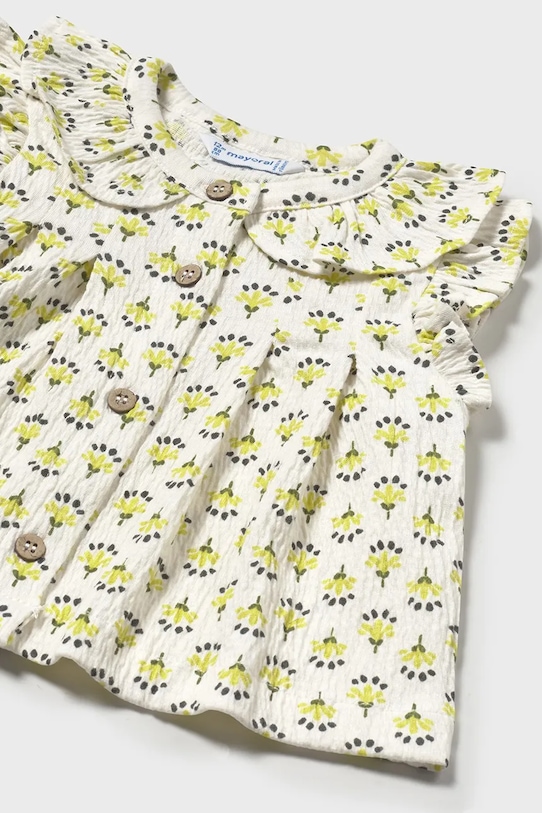 Детская блузка из коллекции Mayoral. Изготовлена из ткани с рисунком, имеет круглый вырез горловины. – Инициатива «Лучший хлопок». Изделия с этой маркировкой содержат не менее 50% хлопка от розничного продавца или бренда, участвующего в инициативе «Лучший хлопок» и инвестирующего в развитие BCI. - Простой дизайн, не стесняющий движений. - Модель с декоративными оборками. - Застежка на пуговицы. - Узорчатая ткань.
