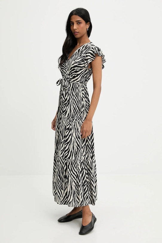 Это платье из коллекции Answear.LAB выполнено из тонкой, неэластичной ткани. Модель выполнена из дышащего вискозного материала. - Расклешенный крой. - Декоративный, заостренный вырез. - Короткий рукав. - Узкая резинка на талии. - Текстильный ремешок в комплекте. - Модель без застежки. - Модель без подкладки. - Длина: 132,5 см. - Ширина под мышками: 47 см. - Размеры указаны для размера: S.