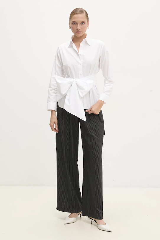 Брюки из коллекции Answear.LAB из ткани с узором. - Застежка на молнию и крючок. - Два накладных кармана спереди. - Карманы для груза обеспечивают дополнительное место для хранения мелких предметов. - Ширина талии: 37 см. - Ширина бедер: 56 см. - Высота талии: 33 см. - Ширина штанины внизу: 30 см. - Ширина штанины: 37 см. - Длина внешнего шва: 110 см. - Размеры указаны для размера: S.