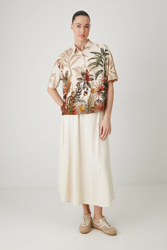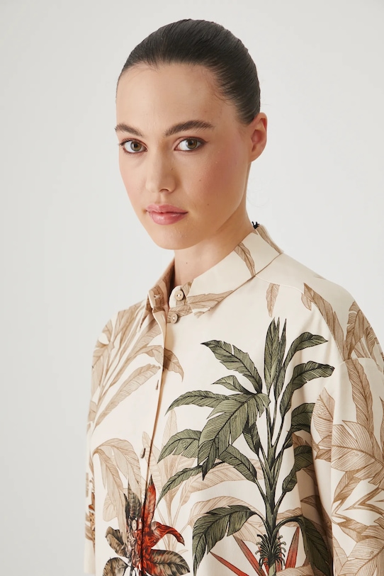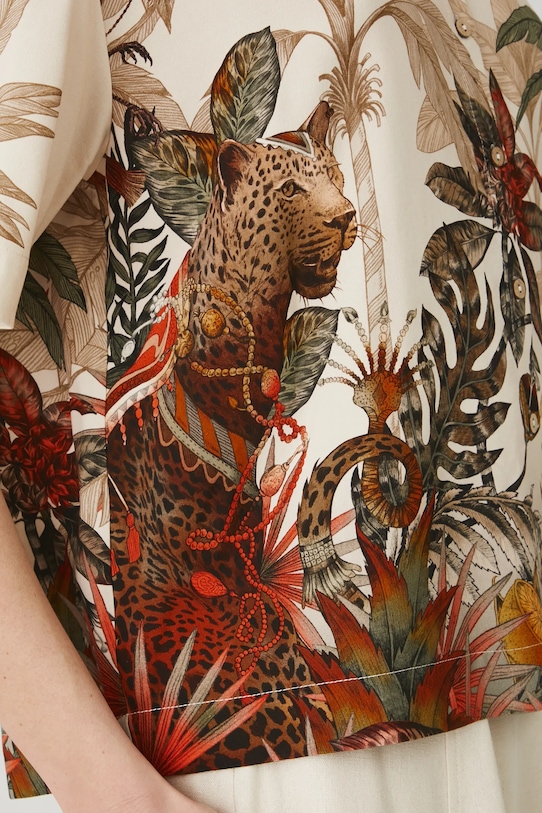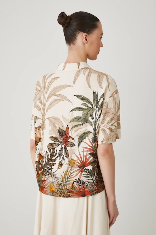 Рубашка из коллекции Medicine. Изготовлена из льняной ткани, с воротником. - Льняной материал обеспечивает комфорт и воздухопроницаемость. - Обычная посадка. - Короткий рукав. - Заниженная линия плеча. - Модель с воротником. - Застежка на пуговицы. - Узорчатая ткань. - Узор с растительными и животными мотивами. - Длина: 62,5 см. - Ширина груди: 59 см. - Размеры указаны для размера: S.