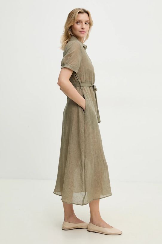 Это платье из коллекции Answear.LAB выполнено из гладкой ткани. Модель выполнена из дышащего, воздушного льна. - Расклешенный крой. - Модель без подкладки. - Модель с воротником. - Короткий рукав. - Удобная застежка на кнопки позволяет легко надевать и снимать. - Пояс на талии корректирует фигуру и еще больше подчеркивает талию. - Два боковых накладных кармана. - Тонкая, неэластичная ткань.