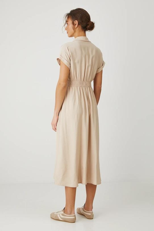 Платье из коллекции Medicine. Расклешенный фасон из гладкой ткани. - Расклешенный крой. - Короткие рукава кимоно. - Острый вырез с воротником. - Застежка на пуговицы. - Эластичный пояс. - Гладкая ткань. - Модель длины миди. - Ширина талии (до растягивания): 36 см. - Ширина талии (в растянутом виде): 49 см. - Ширина груди: 58 см. - Длина: 128 см. - Размеры указаны для размера: S.