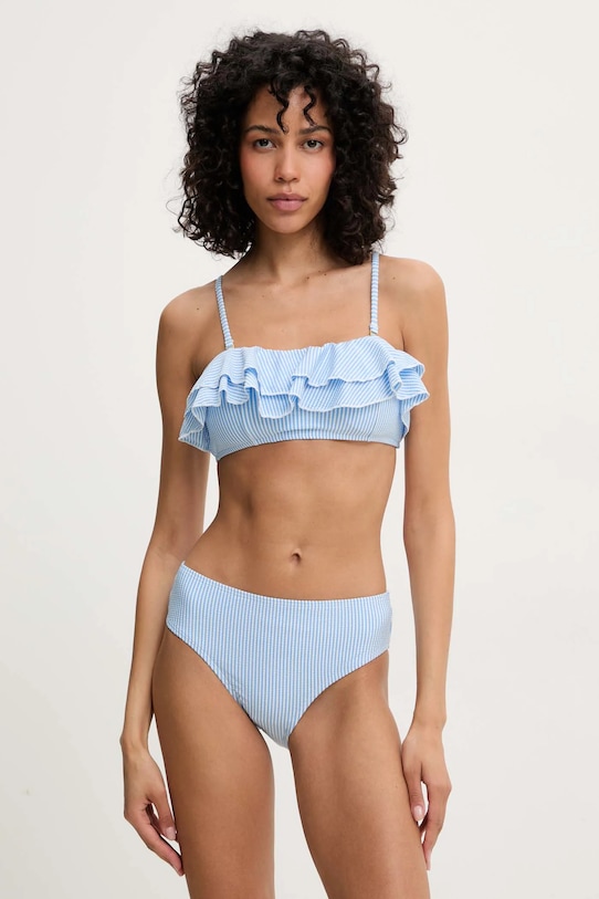 Плавательный бюстгальтер из коллекции Answear.LAB. Изготовлен из эластичной, облегающей ткани. - Съемные подушечки слегка придают жесткость, стабилизируют бюст и обеспечивают дополнительную защиту. - Регулируемые, съемные ремни. - Застежка на крючок. - Плоские швы защищают кожу от натирания и раздражения и обеспечивают высокий уровень комфорта во время занятий спортом. - Модель с декоративной оборкой.