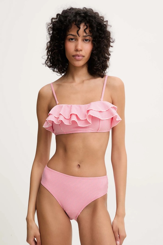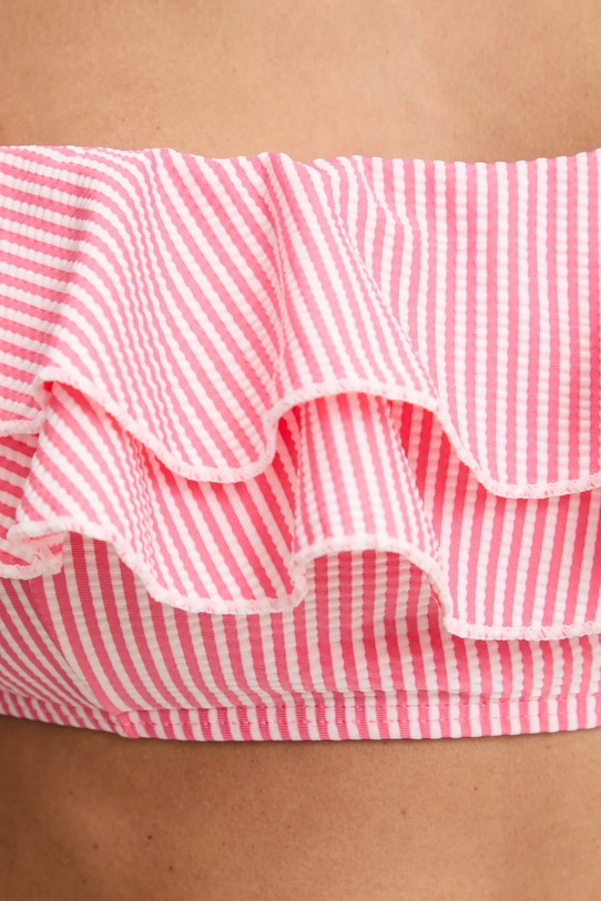 Плавательный бюстгальтер из коллекции Answear.LAB. Изготовлен из эластичной, облегающей ткани. - Съемные подушечки слегка придают жесткость, стабилизируют бюст и обеспечивают дополнительную защиту. - Регулируемые, съемные ремни. - Застежка на крючок. - Плоские швы защищают кожу от натирания и раздражения и обеспечивают высокий уровень комфорта во время занятий спортом. - Модель с декоративной оборкой.