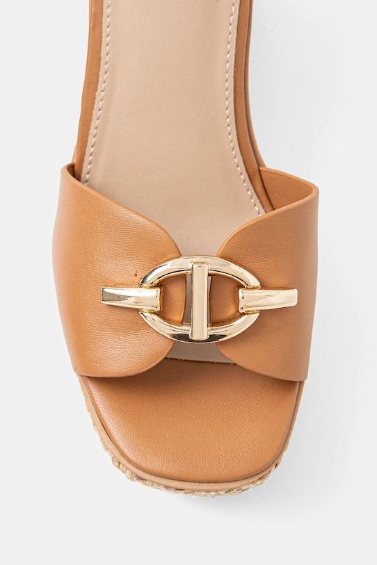 Сандалии из коллекции Aldo. Изготовлены из синтетического материала. - Pillow Walk — удобная стелька из пеноматериала двойной плотности, обеспечивающая стопе амортизацию и комфорт. - Модель с открытой пяткой. - Застежка-пряжка со штифтом для индивидуальной подгонки. - Резиновая подошва прочная и устойчивая к повреждениям. - Модель клина, выполненная из тканого материала. - Декоративная деталь спереди.