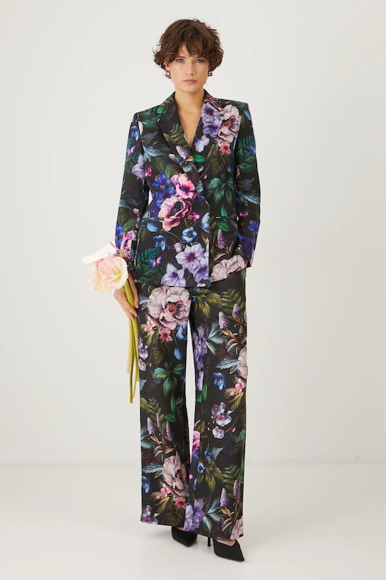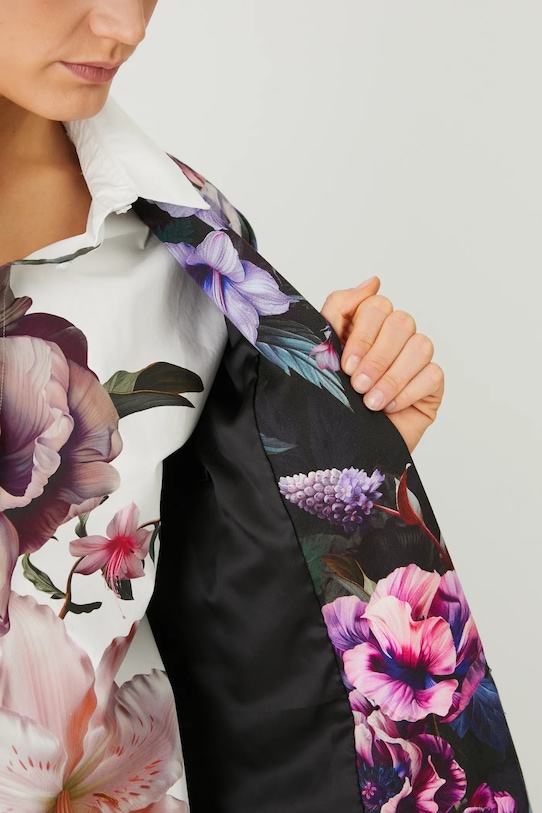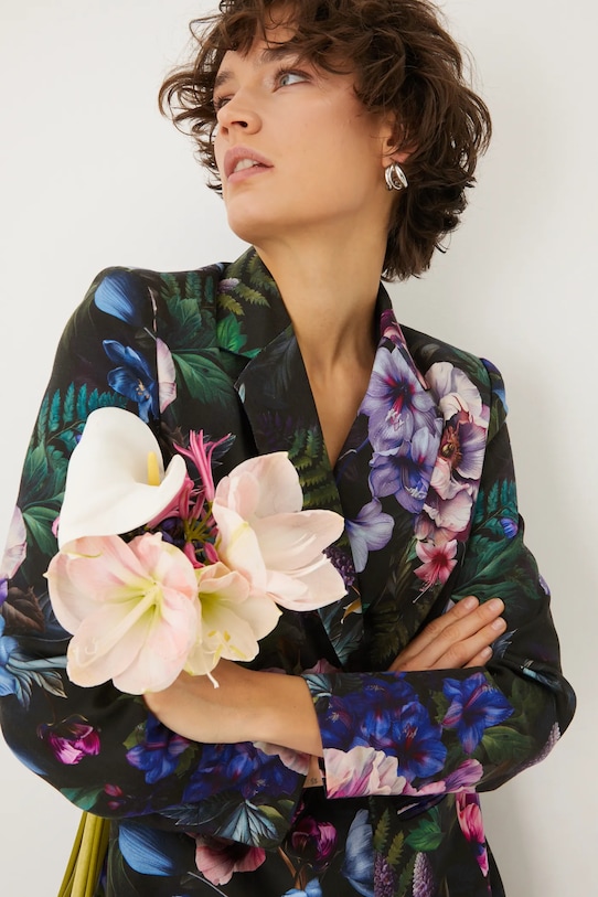 Куртка из коллекции «Медицина». Изготовлена из узорчатой ткани. - Свободный покрой. - Длинный рукав. - Классические лацканы. - В плечах вшиты подкладки. - Двубортный пиджак с застежкой на пуговицы. - Модель на подкладке. - Узорчатая ткань. - Цветочный узор. - Длина рукава: 61 см. - Длина: 74 см. - Ширина груди: 49 см. - Ширина плеч: 40 см. - Размеры указаны для размера: S.