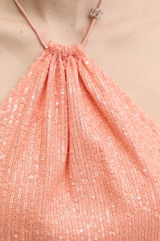 Эта блузка HUGO выполнена из тонкого эластичного трикотажа. Содержание полиэстера делает её менее мнущейся. - Простой дизайн, не стесняющий движений. - Вырез халтер. - Регулируемые, несъемные бретели с завязками на шее. - Дополнительный слой материала в виде подкладки. - Модель выполнена из материала с пайетками. - Длина: 56 см. - Ширина под мышками: 38 см. - Размеры указаны для размера: 36.