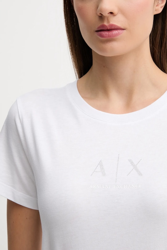 Эта футболка из коллекции Armani Exchange выполнена из тонкой, эластичной ткани. Эта модель выполнена из исключительно комфортного и дышащего материала, идеально подходящего для теплого времени года. - Простой дизайн, не стесняющий движений. - Короткий рукав. - Классический круглый вырез. - Модель со стразами. - Длина: 63 см. - Ширина под мышками: 46 см. - Размеры указаны для размера: S.