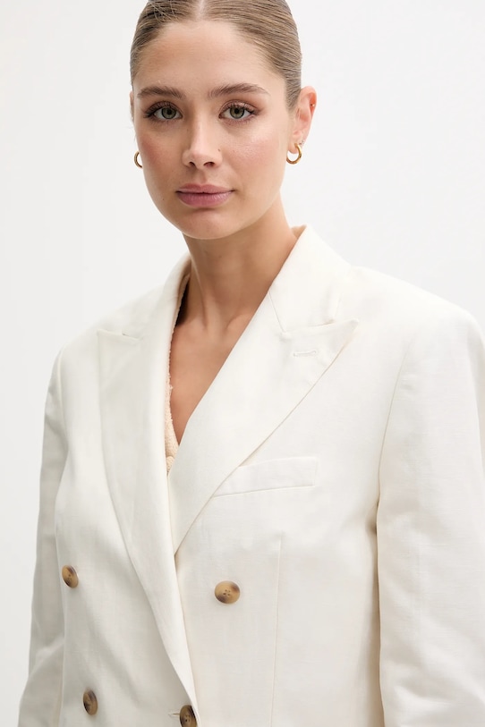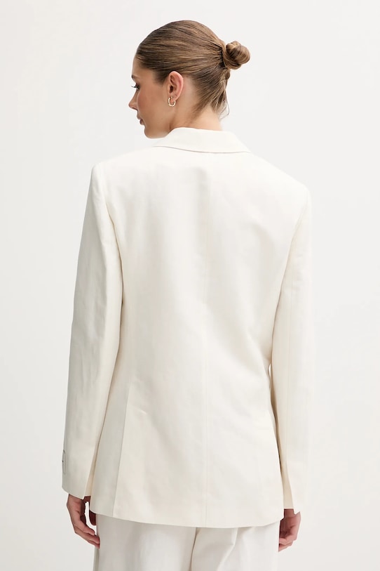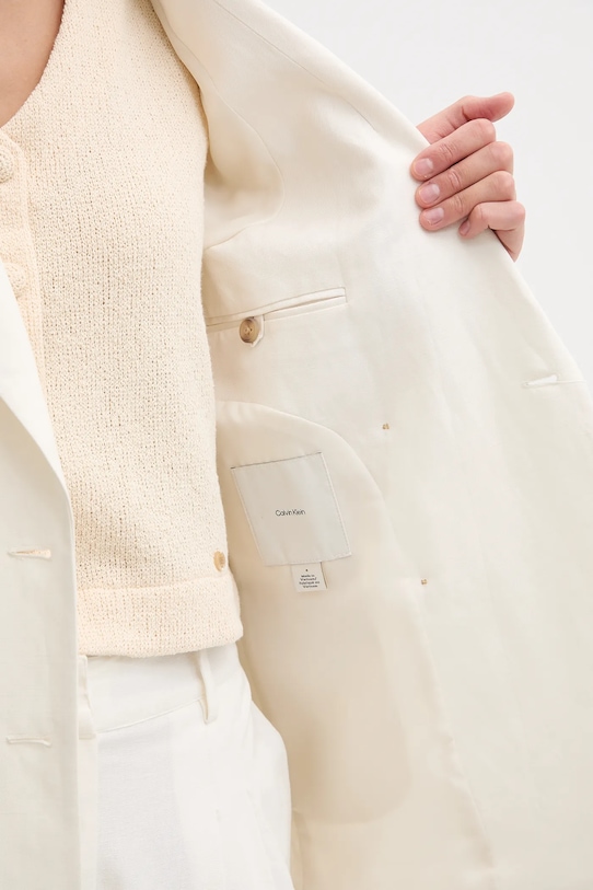Эта куртка Calvin Klein выполнена из тонкой, неэластичной ткани. Модель выполнена из дышащего материала с высоким содержанием льна. - Двубортный пиджак с застежкой на пуговицы. - В плечах вшиты подкладки. - Дополнительный слой материала в виде подкладки. - Два накладных кармана спереди. - Классические лацканы. - Длина: 73 см. - Ширина под мышками: 46 см. - Размеры указаны для размера: S.