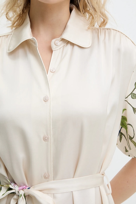 Платье из коллекции Answear.LAB, выполненное из ткани с узором. Доступно эксклюзивно на Answear.com. - Простой дизайн, не стесняющий движений. - Застежка на пуговицы. - Короткий рукав. - Модель с воротником. - Два боковых накладных кармана. - Текстильный ремешок в комплекте. - Длина: 140 см. - Ширина под мышками: 55 см. - Ширина талии: 57 см. - Размеры указаны для размера: S.