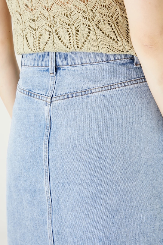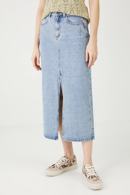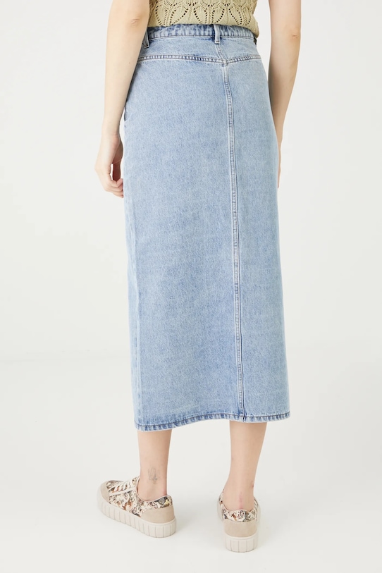Юбка из коллекции Medicine. Модель прямого кроя из хлопкового денима. - Простой дизайн. - Обхват талии обычный. - Застежка на пуговицы и молнию. - Два боковых накладных кармана. - У него есть щель. - Декоративная строчка. - Материал с эффектом стирки. - Модель макси длины. - Ширина талии: 38,5 см. - Длина: 89 см. - Ширина бедер: 49,5 см. - Размеры указаны для размера: M.