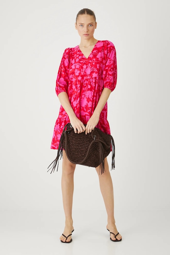 Платье из коллекции «Медицина». Расклешенный фасон из хлопковой ткани. - Расклешенный крой. - Острый вырез. - Рукав три четверти. - Рукава кимоно. - Рукава отделаны резинкой. - Модель с декоративными оборками. - Цветочный узор. - Узорчатая ткань. - Модель мини-длины. - Длина рукава: 43,5 см. - Ширина талии: 48 см. - Длина: 90,5 см. - Размеры указаны для размера: S.