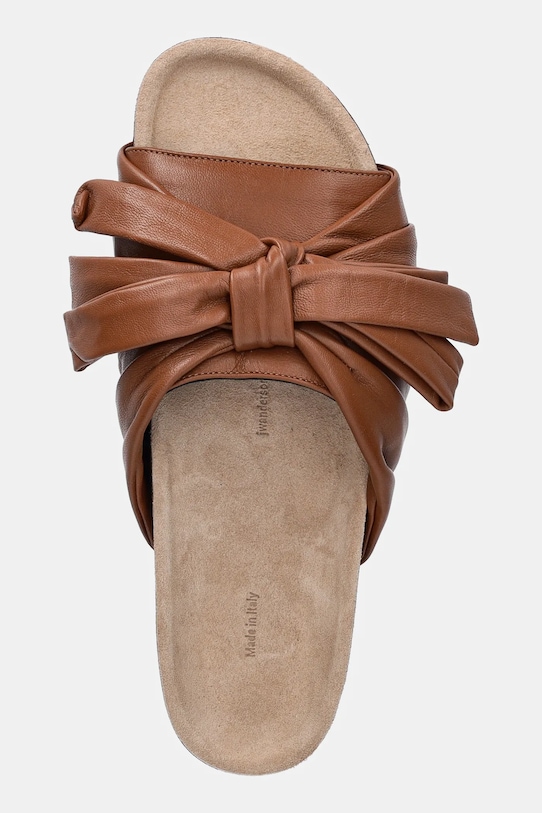 Шлёпанцы из коллекции JW Anderson. Изготовлены из натуральной кожи. - Резиновая подошва прочная и устойчивая к повреждениям. - Гибкий верх легко адаптируется к форме стопы. - Замшевая стелька комфортна для стопы и предотвращает натирание, потертости и неприятные запахи. - Анатомическая стелька поддерживает свод стопы и обеспечивает длительный комфорт. - Модель без застежки, надеваемая вручную.