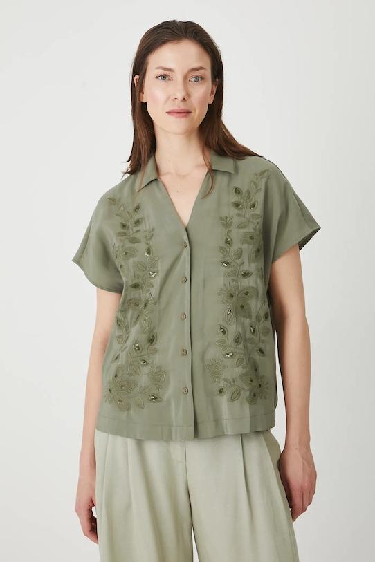 Рубашка из коллекции «Медицина». Изготовлена из ткани с аппликацией, с воротником. - Большой размер. - Короткие рукава кимоно. - Острый вырез с воротником. - Застежка на пуговицы. - Модель с декоративной аппликацией из пайеток. - Модель с декоративной вышивкой. - Модель выполнена из модальной ткани. - Длина: 65 см. - Ширина груди: 55 см. - Размеры указаны для размера: S.