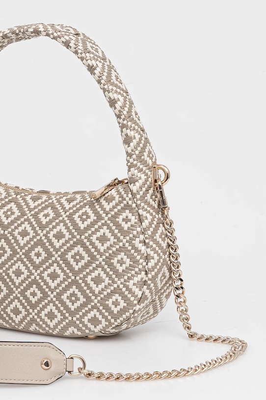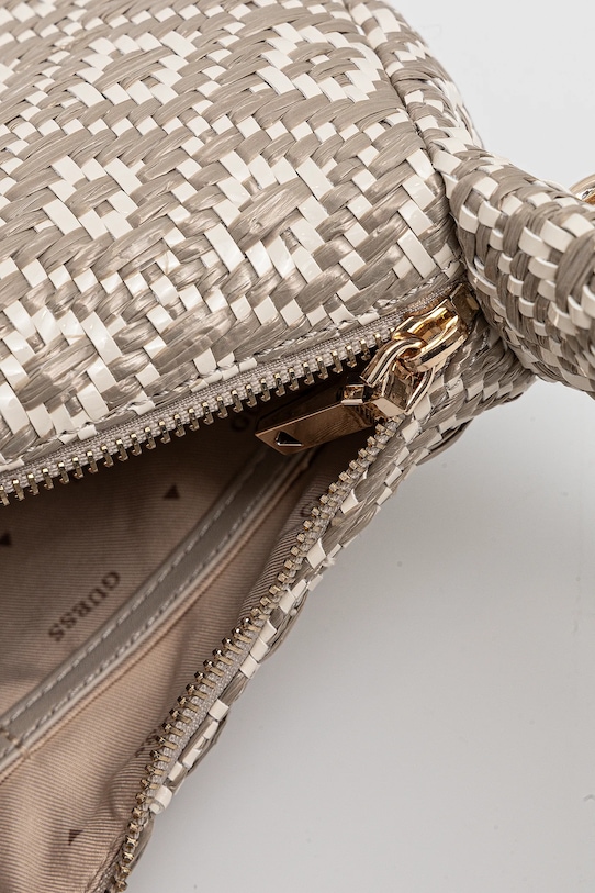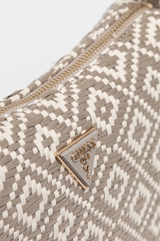 Небольшая сумочка из коллекции Guess. Модель на молнии, выполнена из тканого материала.