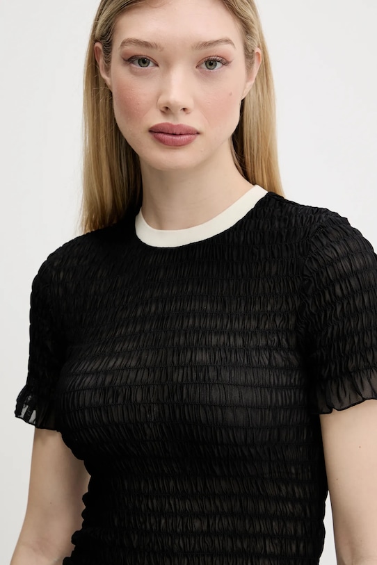 Эта футболка из коллекции Guess Originals выполнена из тюля. Высокоэластичный материал обеспечивает полную свободу движений. - Модель изготовлена из волокон, полученных с использованием экологически безопасных производственных процессов, что позволяет снизить воздействие на окружающую среду. - Приталенный крой, подчеркивающий силуэт. - Классический круглый вырез. - Декоративные оборки.