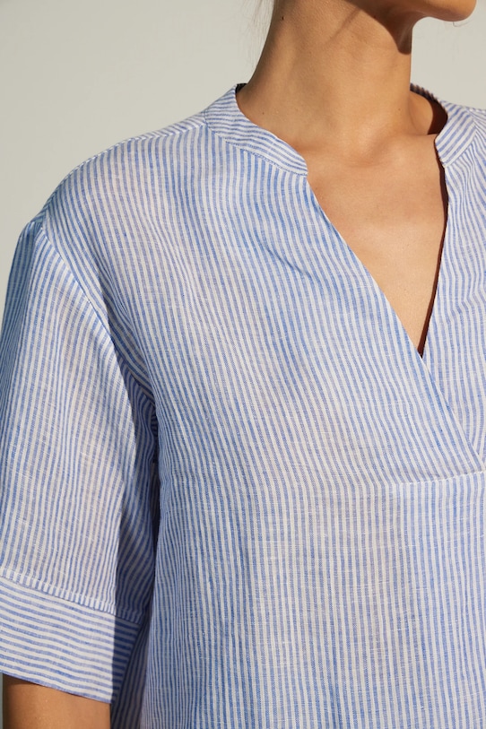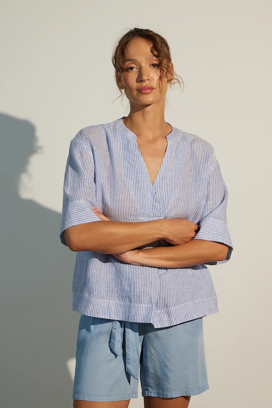 Эта блузка из коллекции Medicine выполнена из льна и имеет заостренный вырез. - Натуральный, воздушный и прочный материал, изготовлен из 100% льна. - Большой размер. - Короткий рукав. - Заниженная линия плеча. - Острый вырез. - Декоративная закладка. - Узорчатая ткань. - Полосатый рисунок. - Ширина груди: 55 см. - Длина: 64 см. - Размеры указаны для размера: S.