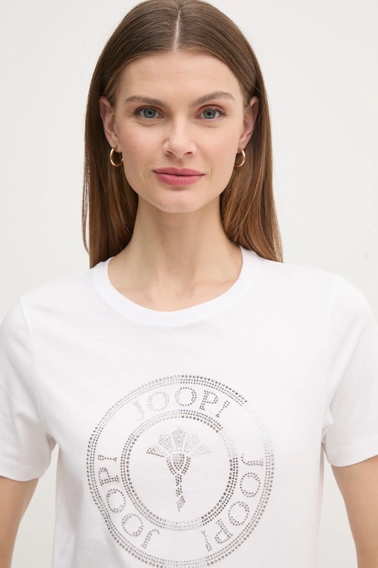Футболка из коллекции Joop! из тонкой эластичной ткани. Модель выполнена из исключительно комфортного хлопкового материала. - Простой дизайн, не стесняющий движений. - Классический круглый вырез. - Короткие рукава специальной конструкции обеспечивают полную свободу движений. - Модель с аппликацией. - Длина: 62 см. - Ширина под мышками: 43 см. - Размеры указаны для размера: 34.
