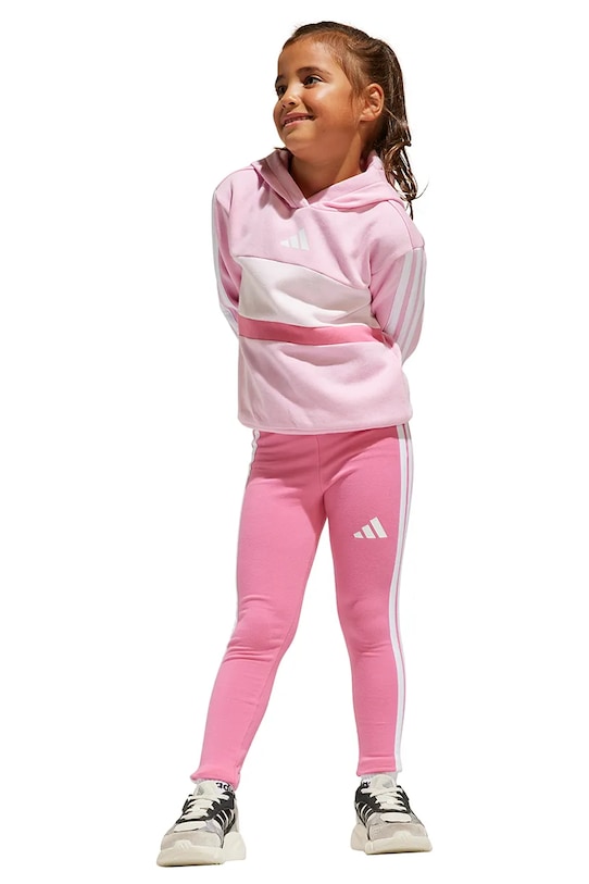 Этот трикотажный комплект adidas изготовлен из исключительно удобного материала с высоким содержанием хлопка. - В комплект входят толстовочка и леггинсы. - Мягкая внутренняя отделка обеспечивает высокий комфорт использования и оптимальный тепловой комфорт. - Модель с капюшоном. - Рукава и низ изделия отделаны удобными эластичными манжетами. - Модель с полосками. - Эластичный пояс.