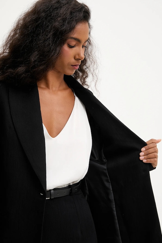 Блейзер из коллекции Answear.LAB, выполненный из тонкой неэластичной ткани. Доступен эксклюзивно на Answear.com. - Простой дизайн, не стесняющий движений. - Модель на подкладке. - Застежка на пуговицы. - В плечах вшиты подкладки. - Имитация карманов спереди. - Длина рукава: 65 см. - Длина: 75 см. - Ширина под мышками: 45 см. - Размеры указаны для размера: S.