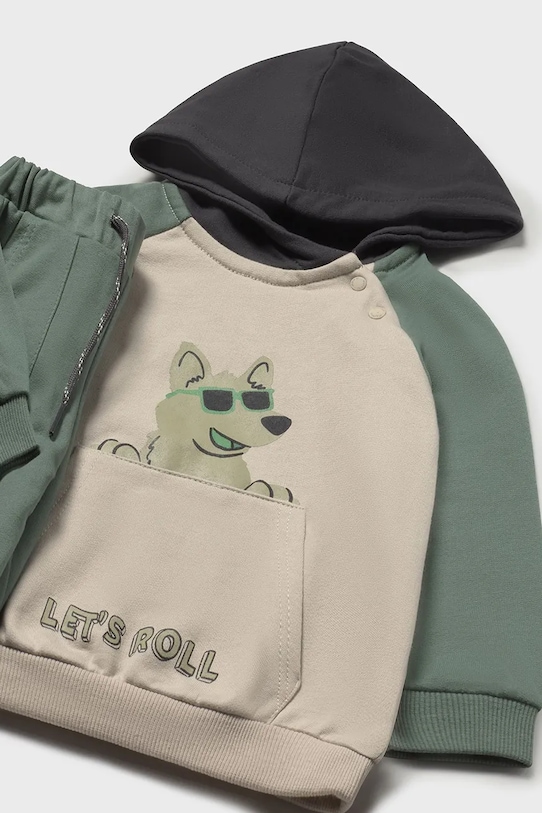 Этот детский комплект из коллекции Mayoral выполнен из лёгкой эластичной ткани, обеспечивающей полную свободу движений. В комплект входят толстовка и две пары штанов. - Простой дизайн, не стесняющий движений. - Застегивается на короткую кнопку на вырезе горловины. - Отделка ребер. - Эластичный пояс. - Завязки на талии. - Модель с капюшоном. - Длинный рукав.