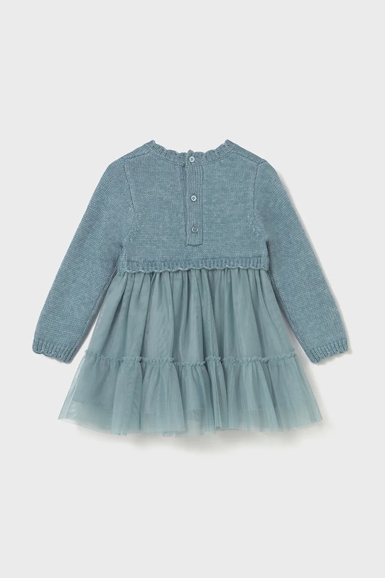 Детское платье из коллекции Mayoral. Расклешенный фасон выполнен из хлопкового трикотажа. Технология Gymdigo сочетает комфорт трикотажа с прочностью денима. - Расклешенный крой. - Застегивается на пуговицы сзади. - Длинные рукава с удобными эластичными манжетами. - Классический круглый вырез. - Привлекающие внимание оборки. - Декоративные вставки из тюля.