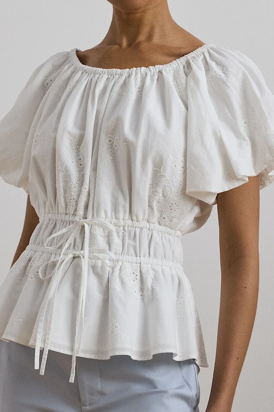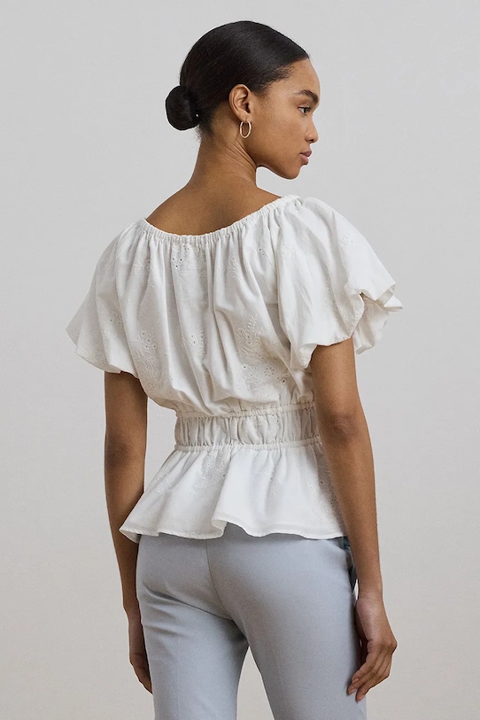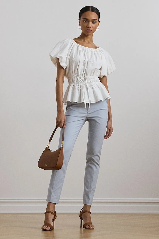 Эта блузка из коллекции Lauren Ralph Lauren выполнена из лёгкой ткани, идеально подходящей для тёплого времени года. Она имеет круглый вырез и выполнена из приятного на ощупь хлопка. - Приталенный крой с привлекательными оборками. - Классический круглый вырез. - Объемные рукава с ребристыми манжетами. - Завяжите на талии. - Модель с декоративной вышивкой.