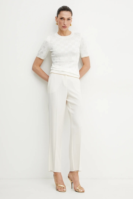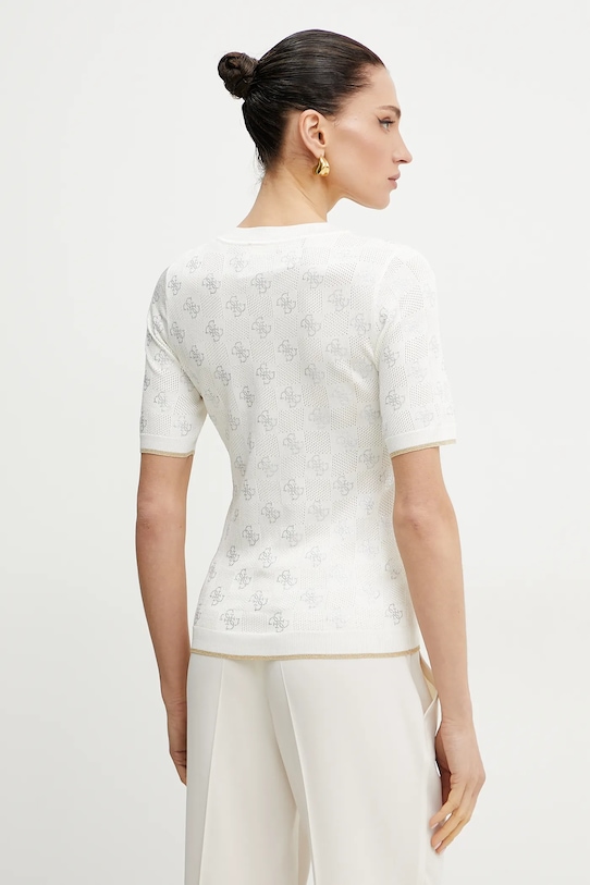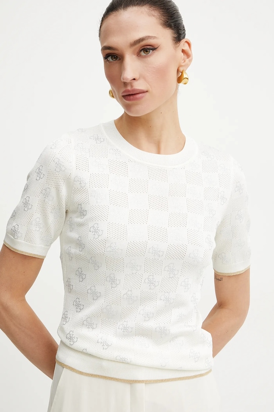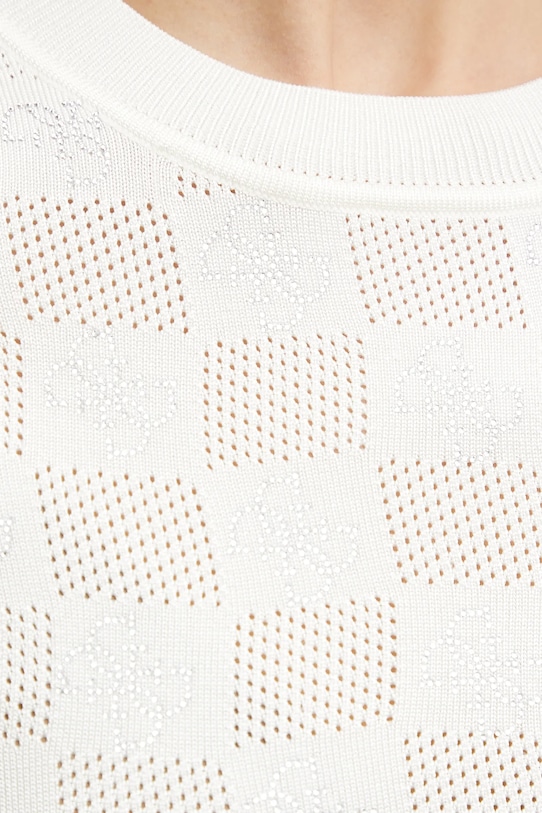 Этот свитер из коллекции Guess выполнен из тонкого, высокоэластичного трикотажа. Он украшен эффектной мерцающей аппликацией.