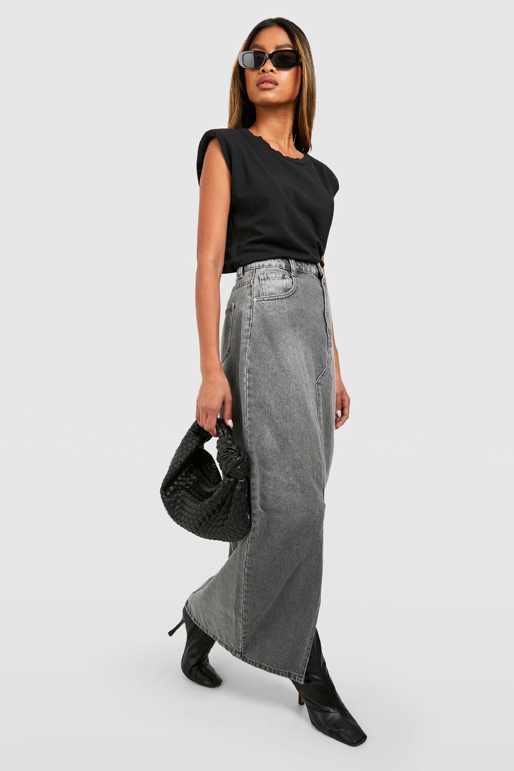 Джинсовая юбка макси с разрезами передней части Boohoo, серый