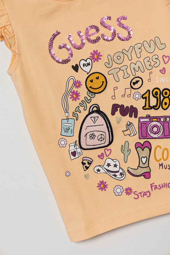 Детская футболка из коллекции Guess выполнена из тонкой, эластичной ткани. Модель выполнена из исключительно комфортного материала с высоким содержанием хлопка. - Этот продукт частично изготовлен из органического хлопка. - Простой дизайн, не стесняющий движений. - Классический круглый вырез. - Модель с декоративными оборками.