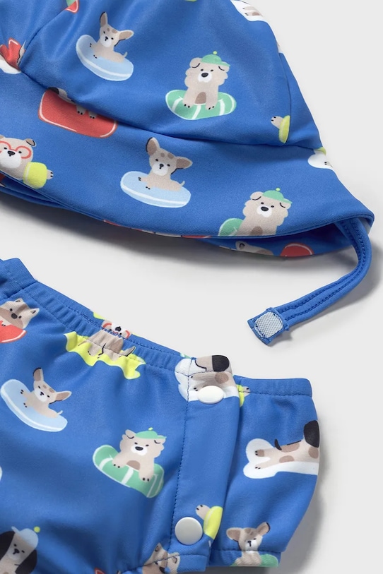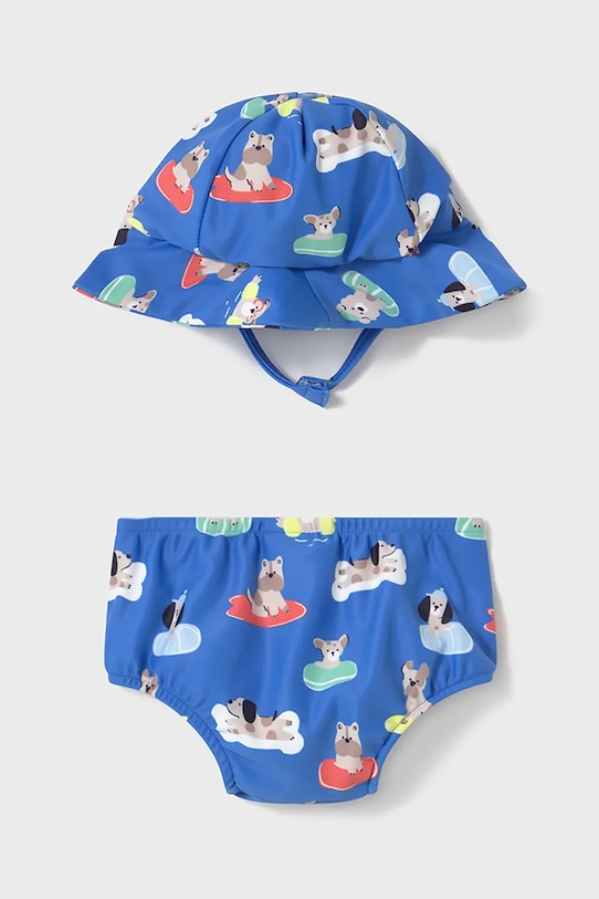 Плавки из коллекции Mayoral Newborn. Изготовлены из эластичной ткани с рисунком. В комплект входит шапочка.