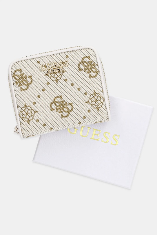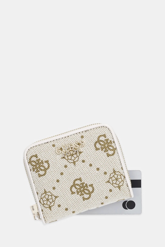 Небольшой кошелек из коллекции Guess. Изготовлен из комбинации текстиля и экокожи.