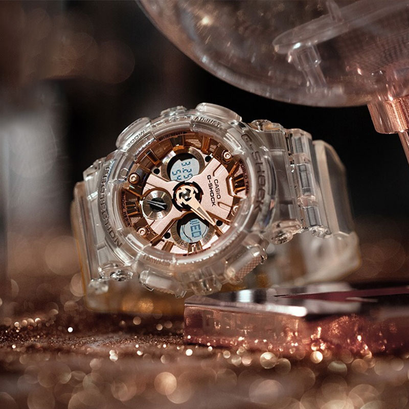 Модель, созданная на основе популярной цифро-аналоговой модели GA-120, представлена в среднем размере. Прозрачный ремешок в сочетании с циферблатом розово-золотистого оттенка создает спортивную унисекс-модель для повседневной носки. Модный и компактный G-SHOCK, идеально подходящий для молодёжной культуры.