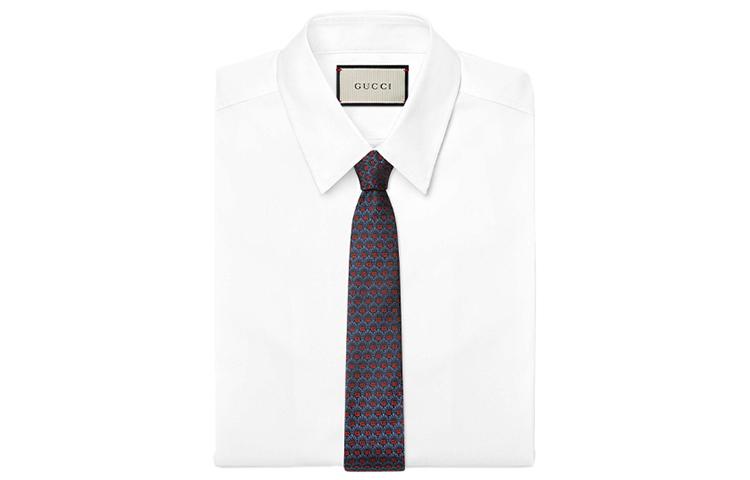 Этот галстук выполнен из тёмно-синего шёлкового твила с графичным жаккардовым узором, включающим красный логотип GG, дополненный цветочными мотивами. Фирменные элементы бренда в сочетании с инновационными деталями и декоративными мотивами продолжают украшать последнюю коллекцию.