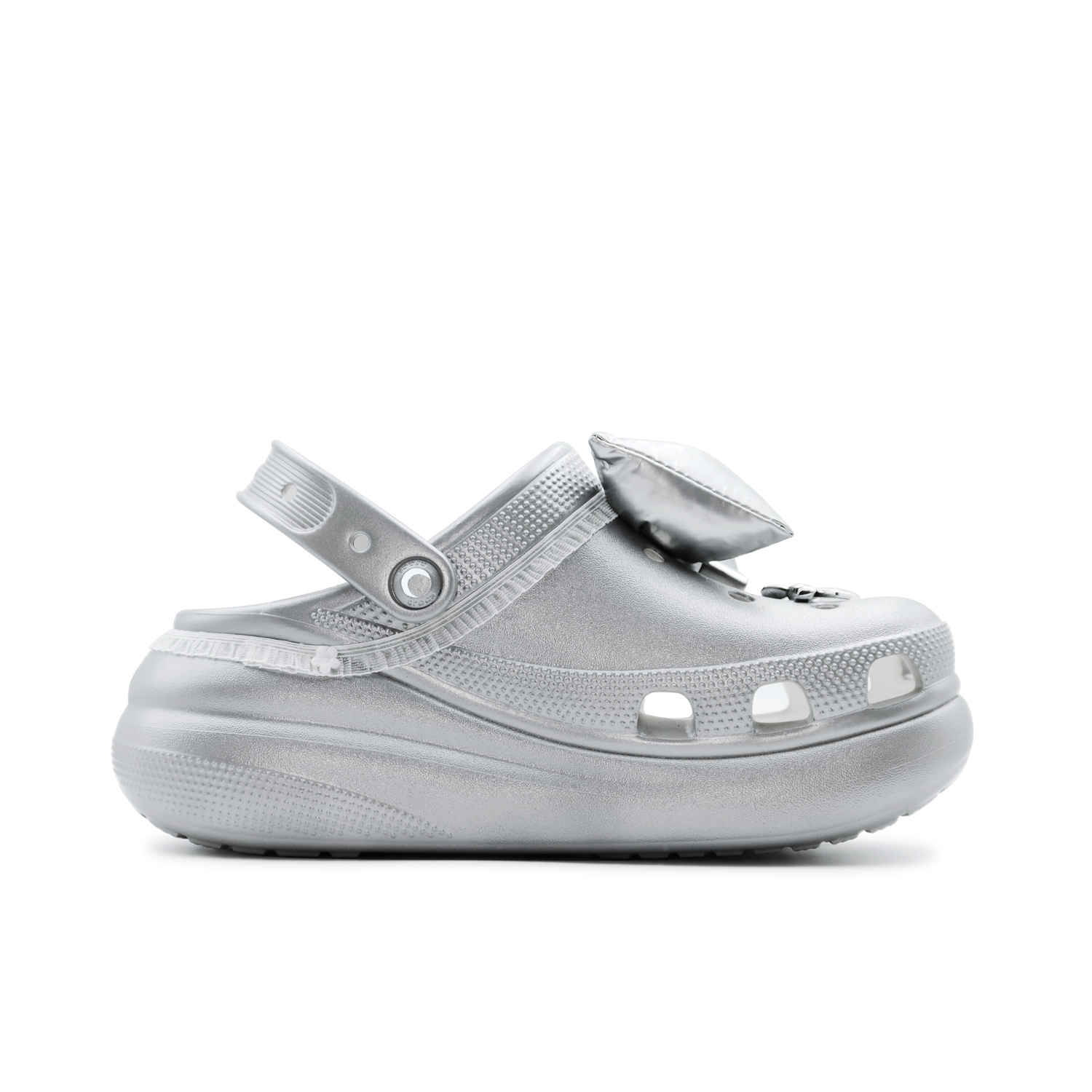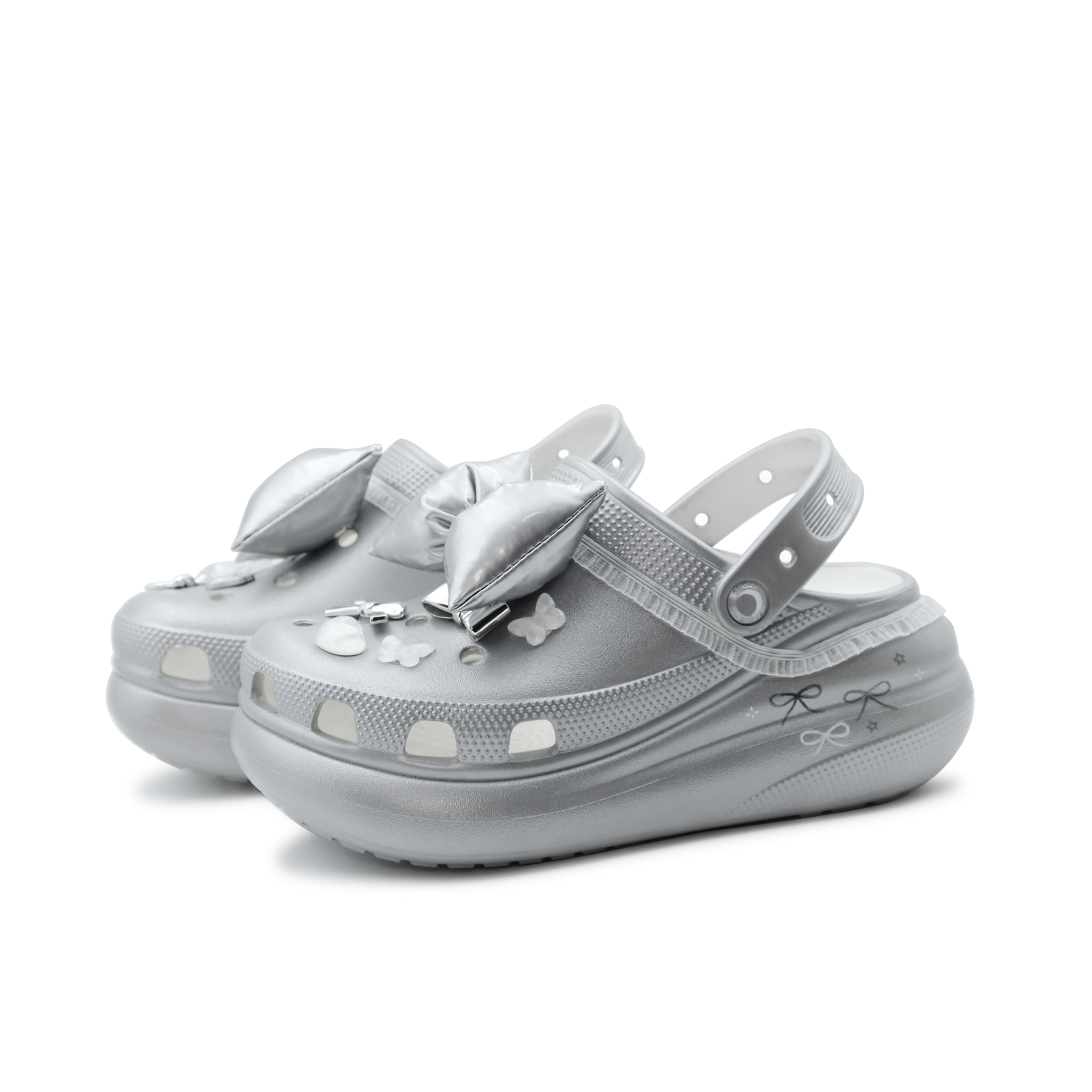 Эти кастомные кроссовки представляют собой оригинальные сандалии Crocs Classic Clog Puff, унисекс, белого цвета. Вдохновленные романтической эстетикой панка и темой «бантик», эти кастомные кроссовки выполнены в сером цвете и имеют верх, раскрашенный распылением в стиле граффити. Многочисленные граффити в стиле бантиков добавляют нотку оригинальности. Съёмная пряжка-бантик добавляет многослойности. Вся обувь перекрашена фирменной краской, а затем вручную пропитана, отполирована и состарена для придания изысканного вида. Благодаря уникальному мастерству изготовления кастомных кроссовок, каждая пара может иметь небольшие различия.