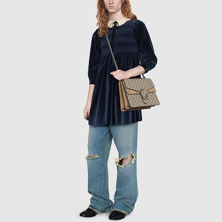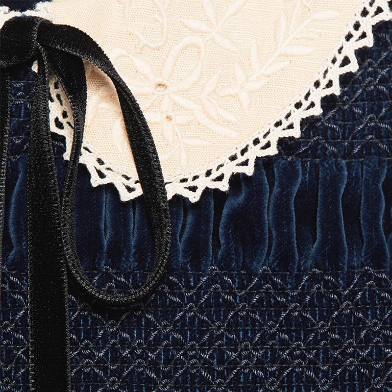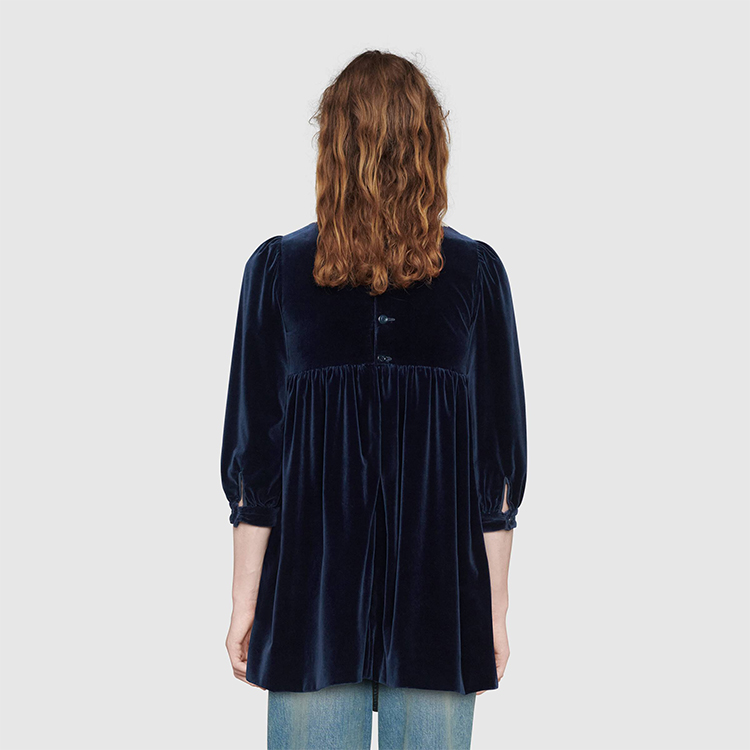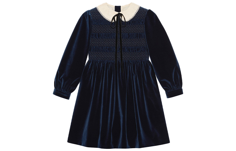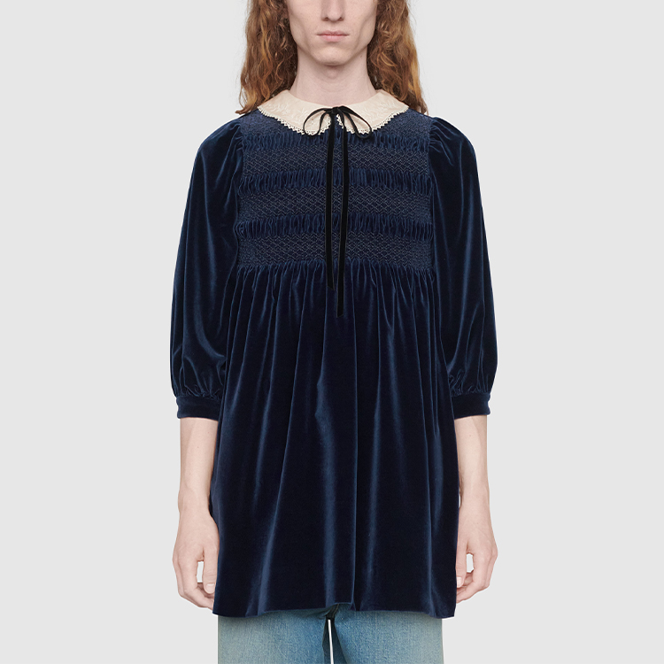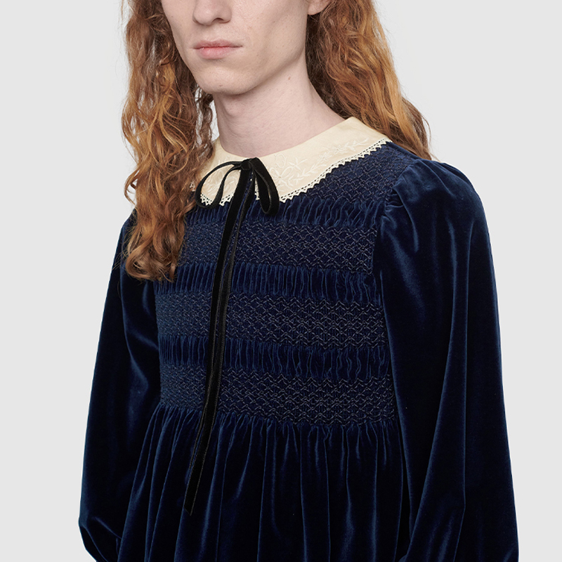 Коллекция осень-зима 2020 вновь демонстрирует увлечение креативного директора Алессандро Микеле винтажными силуэтами и причудливыми деталями детской одежды. Это мини-платье из темно-синего бархата вдохновлено этой темой, искусно сочетая игривые детали, такие как очаровательный кружевной воротник «Питер Пэн» и присборенную вышивку. Короткая длина и длинные рукава-фонарики создают свежий и нежный образ. На внутренней этикетке Gucci размещен девиз «Rave Like You Are Five» («Рейв, как будто тебе пять»), отмечающий пятилетие Алессандро Микеле на посту креативного директора и перекликающийся с темой сезона – невинное детство.