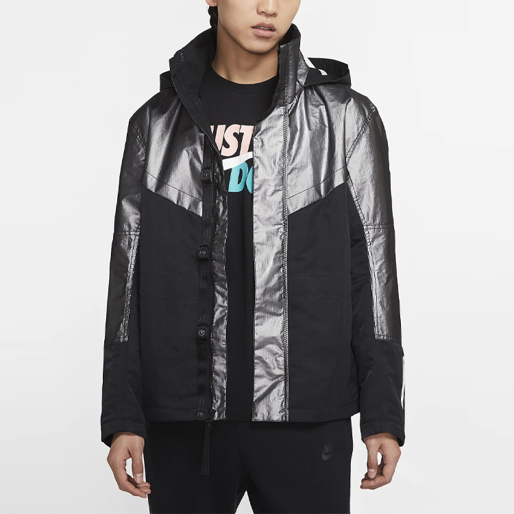 Куртка с длинными рукавами, утепленная Thermore, из металлизированной серебристой парусины и черного нейлонового твила. Оверлочная строчка черного цвета по всей длине.