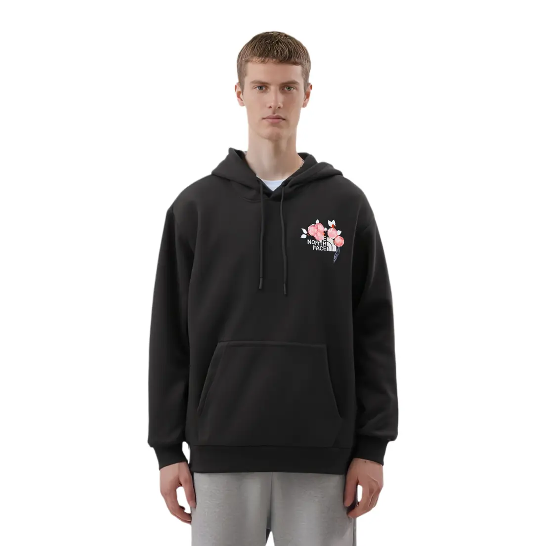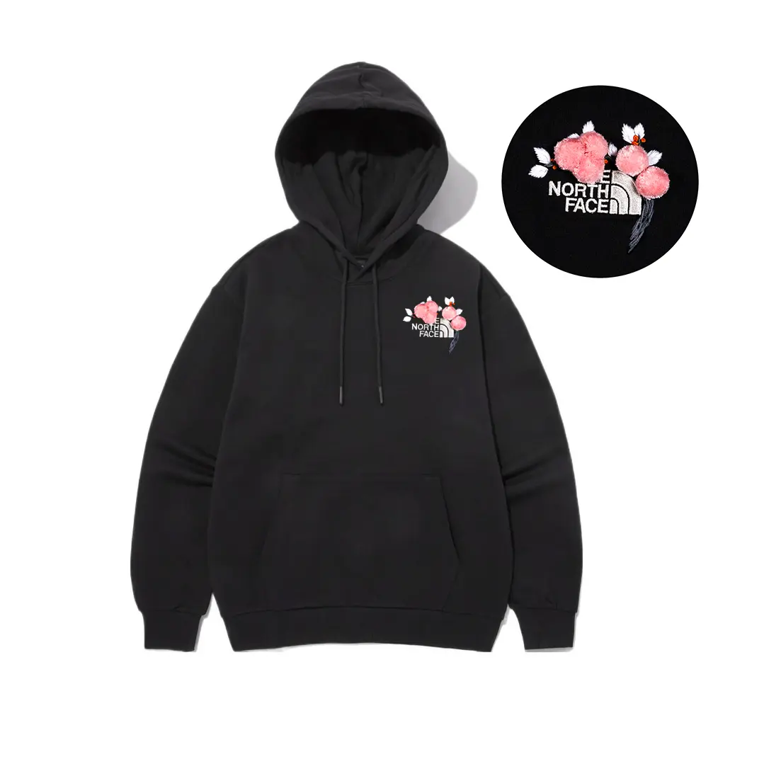 Эта мужская спортивная толстовка с капюшоном, выполненная по индивидуальному заказу, представляет собой однотонную чёрную толстовку с вышитым логотипом от The North Face. Вышитый узор представляет собой оригинальный французский узор с белыми персиками. Розовые персики связаны вручную, а цветы переплетаются с логотипом, создавая эффект многослойности. Эта вещь символизирует красоту и чистоту, создавая уникальный и индивидуальный образ, значительно снижая вероятность встретить кого-то в такой же одежде. Расположение узора на каждой вещи может немного отличаться. В связи с особенностями изготовления и материалов, избегайте острых предметов, длительного замачивания или сушки при высоких температурах.