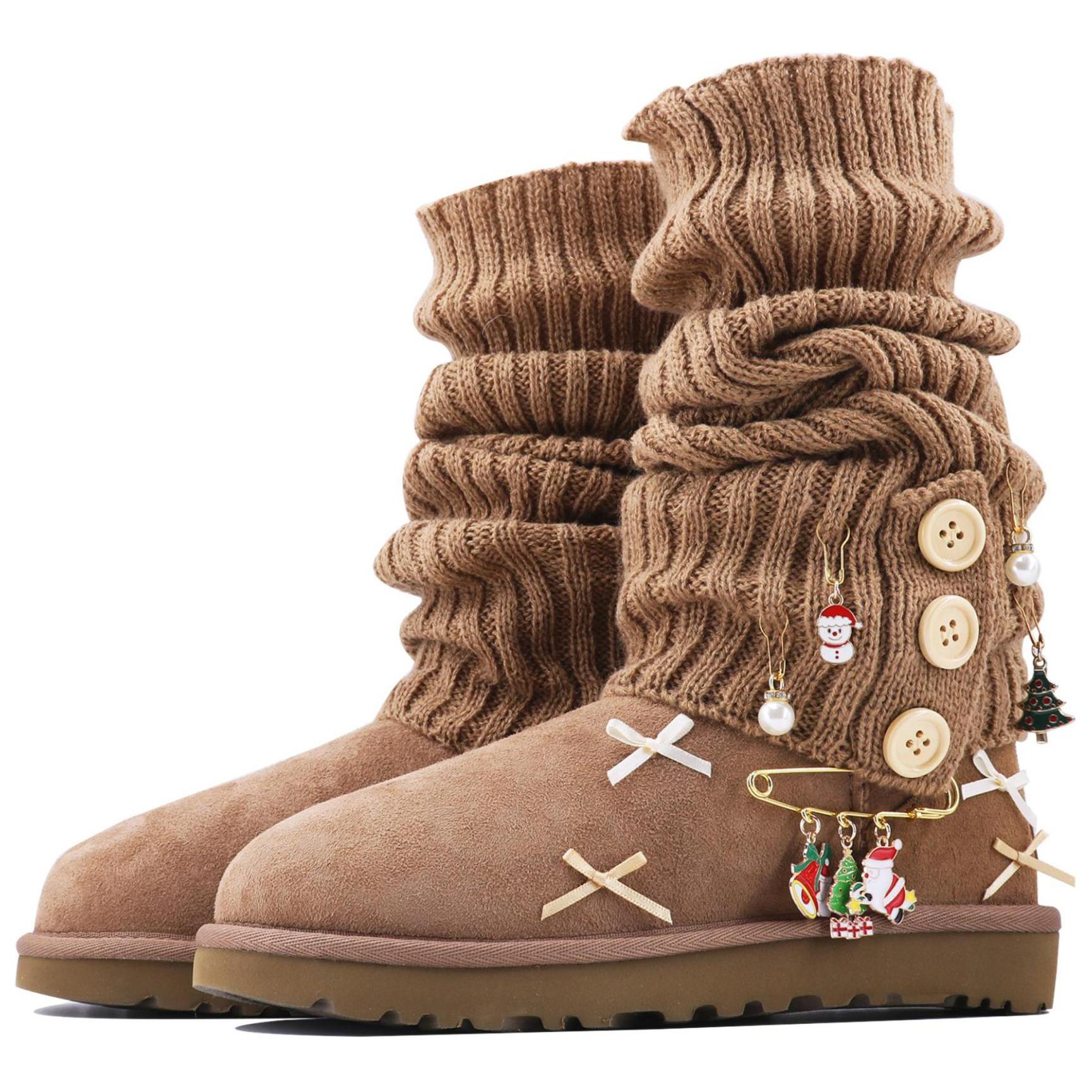 Эти кроссовки изготовлены из оригинальных теплых, прочных, удобных и повседневных коротких зимних сапог UGG Classic Mini овчина в бордовом цвете. Дизайн вдохновлен Рождеством, а коричневая цветовая гамма создаёт мультяшный образ. Кроссовки можно носить и стирать как обычно, но избегайте интенсивных физических нагрузок и царапин от острых предметов. Не используйте концентрированные органические растворители при чистке. Используйте мягкую щётку и моющее средство подходящей концентрации. Это модель для самостоятельной сборки, некоторые аксессуары можно снять для индивидуальной настройки. В комплект входят одна пара гетр и девять пар аксессуаров. Подарочная версия поставляется с подарочным пакетом.