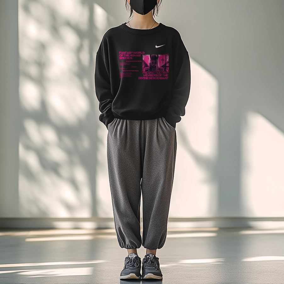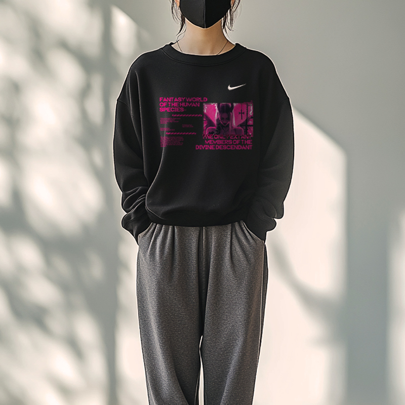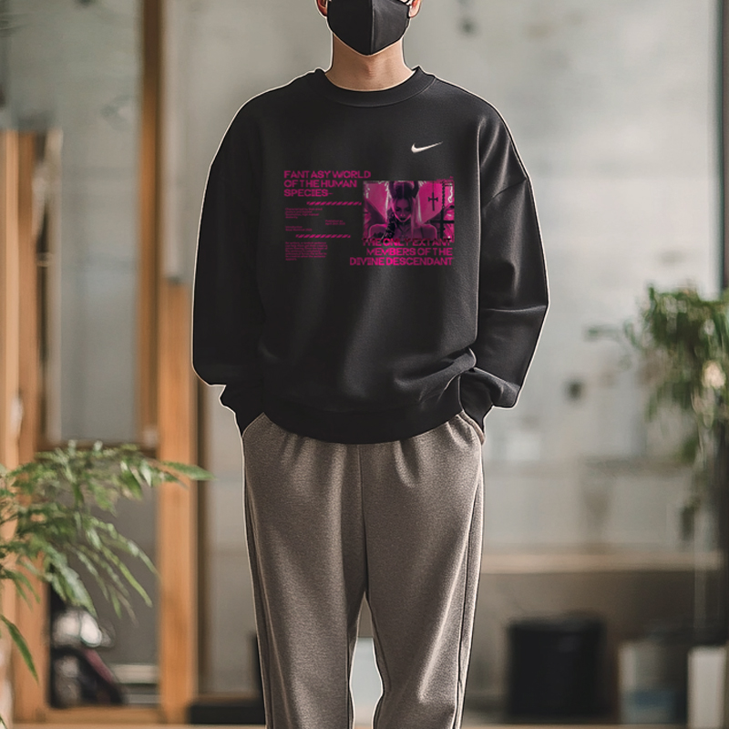 Эта модель, изготовленная на заказ, представляет собой оригинальную чёрную толстовку с круглым вырезом и длинными рукавами, украшенную логотипом Nike. Этот оригинальный дизайн — первый в своём роде, с принтом высокой чёткости, что минимизирует вероятность того, что вы наденете такую же вещь, как и другие.